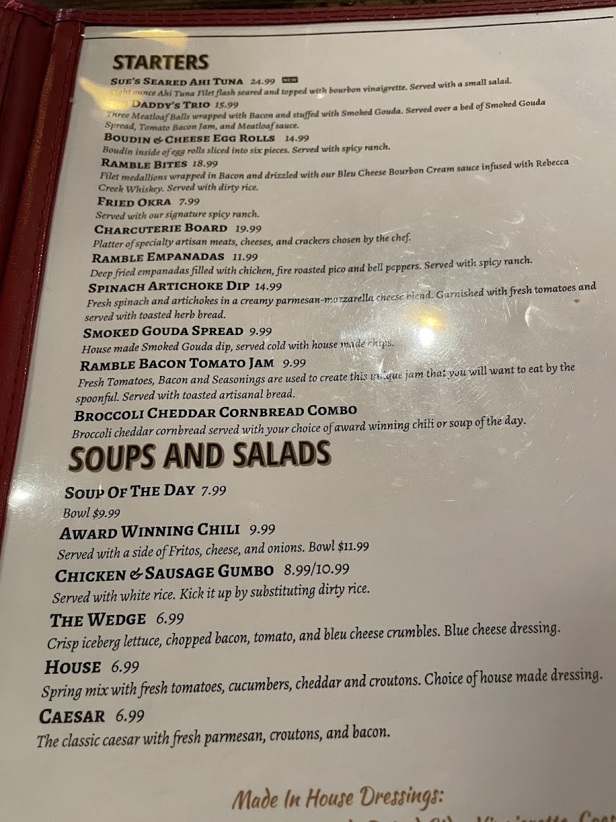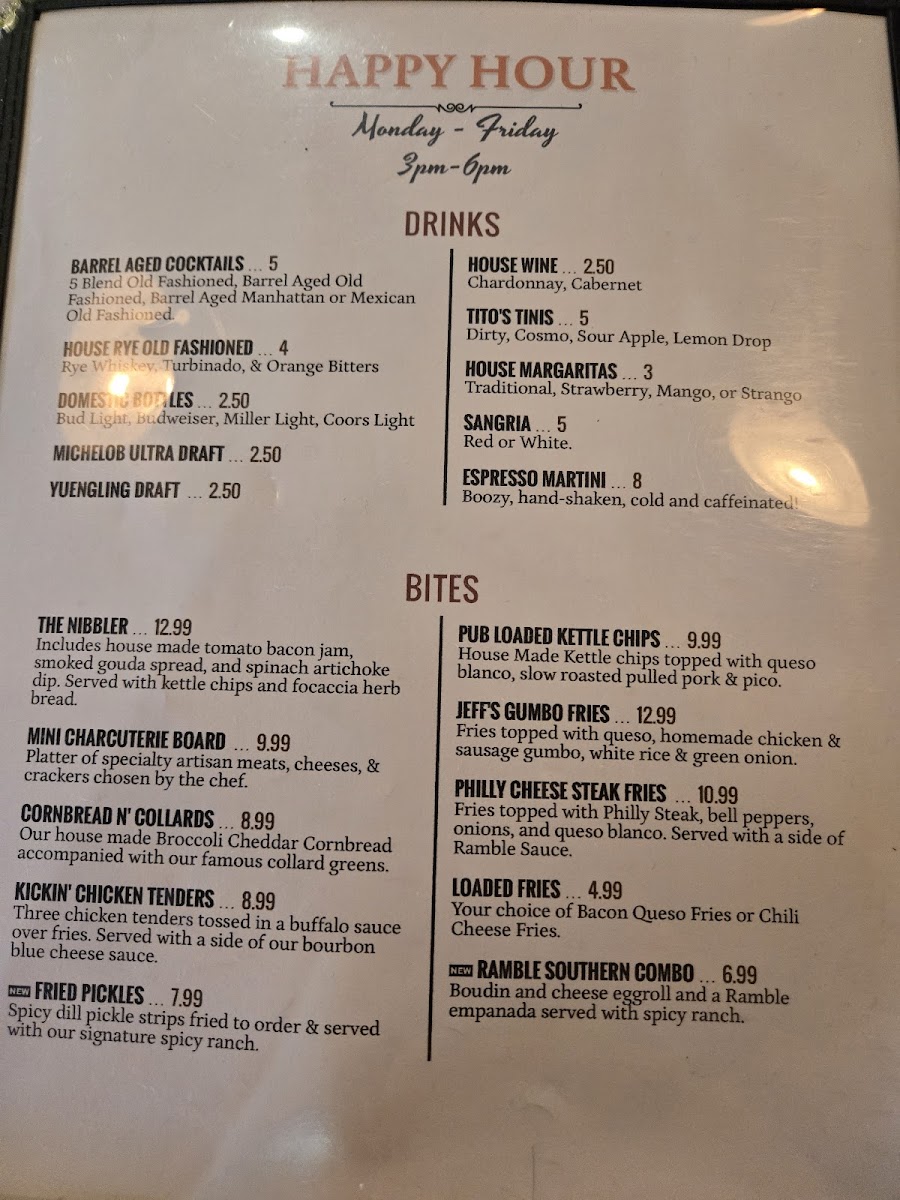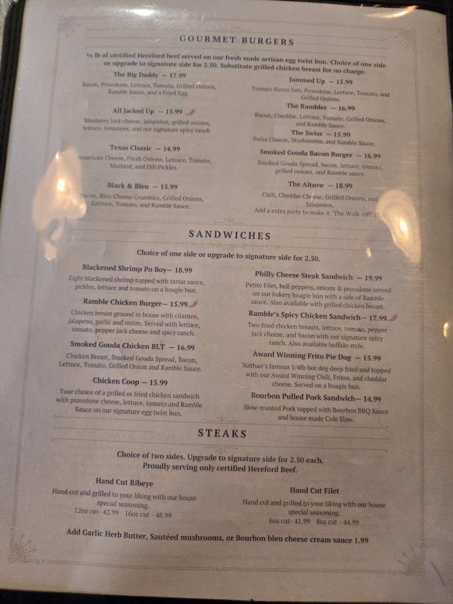 Starters like the creamy Spinach Artichoke Dip and unique Ramble Tomato Bacon Jam are perfect for kickstarting your meal. Move to the sandwiches, where the Bourbon Pulled Pork Sandwich dazzles with its smoky flavor, complemented by house-made coleslaw.